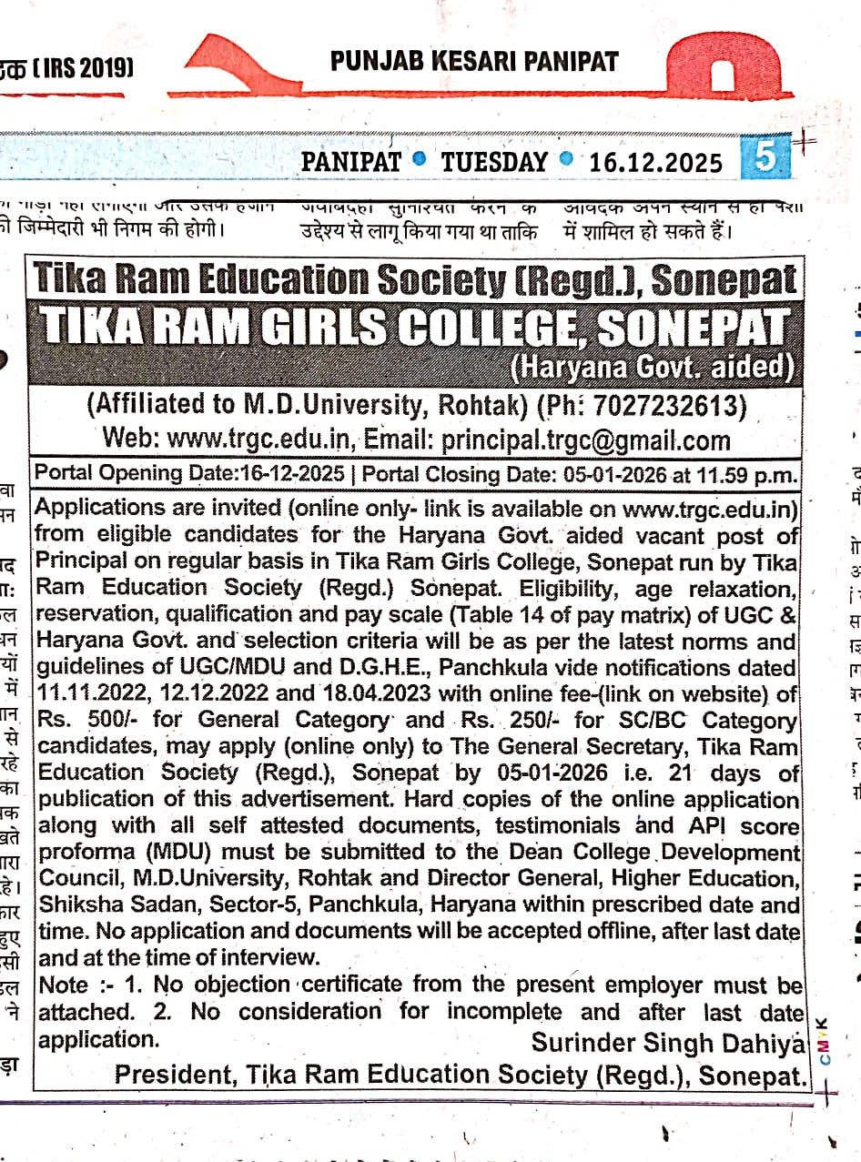 Tika Ram Girls College , Sonepat successfully conducted 150th anniversary of our National Song with Mass Singing of Complete version "Vande Matram" with approx 150 student strength , Faculty and staff , on 7th November , 2025 .Our Principal and Faculty also addressed about signficance in India`s Freedom movement .