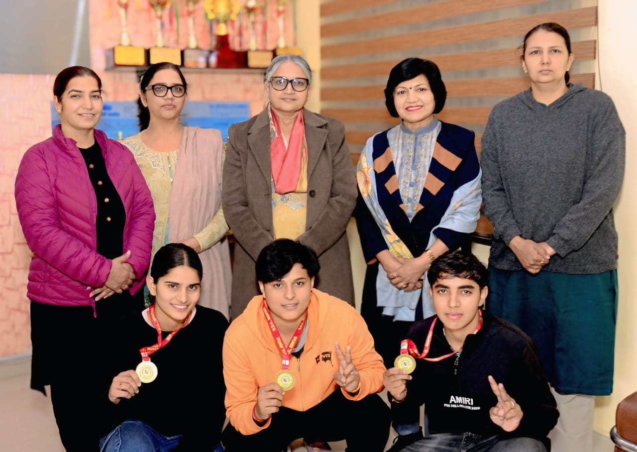 Our Hockey team got gold medal at All India Inter University tournament. Our president sh. Surinder Singh Dahiya congratulated the team for this great achievement. Principal Dr Monika Verma felicitated the girls with sweets for their victory.