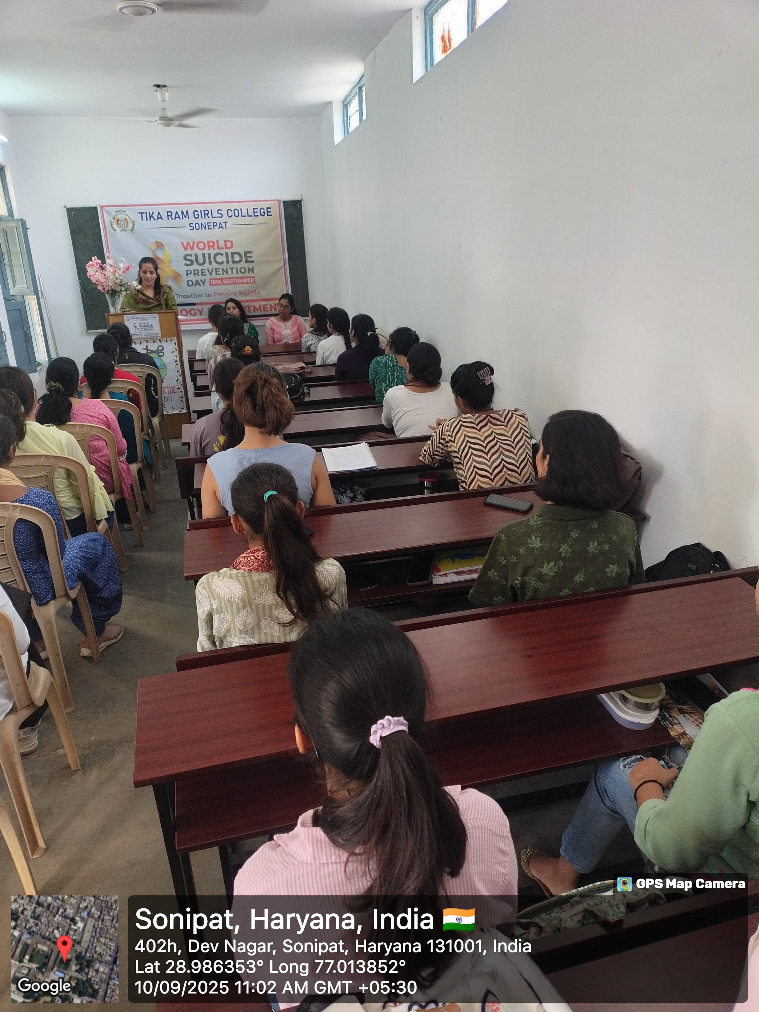 On the occasion of "World Suicide Prevention Day" The Psychology Department organized a COUNSELLING PROGRAM. The program was inaugurated with an awareness message by the Principal Mam Mrs. Geeta, who encouraged the students to stay aware. In the counseling session, Ms. Anu from Psychology Department presented her views and emphasized that for mental health, one should adopt professional counseling. medical assistance, and proper treatment, and when needed, seek help from the right specialists and take appropriate steps towards overcoming such challenges.