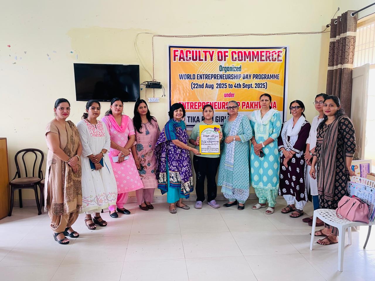 दिनांक 3 सितंबर 2025 को टीकाराम कन्या महाविधालय में उधमिता दिवस कार्यक्रम (22.08.2025 से 4.09.2025 ) उधमिता पखवाड़े के तहत वाणिज्य विभाग द्वारा सेमिनार का आयोजन किया गया | जिसका विषय उधमिता विकास रहा | सेमिनार में मुख्य वक्ता की भूमिका प्रो. राज रूप चहल ( सी. आर. ए. कॉलेज) ने निभाई | इस का शुभ आरंभ कॉलेज प्राचार्या श्रीमती गीता द्वारा किया गया | इस सेमिनार में बीकॉम, एमकॉम, बी. ए अर्थशास्त्र विभाग की छात्राओं ने भाग लिया | मुख्य वक्ता प्रो. राजरूप चहल द्वारा छात्राओं को उधमिता से संबंधित विषयों पर जानकारी दी | उधमिता पखवाड़े कार्यक्रम में समन्वयक की भूमिका डॉ निशा ने निभाई | इस मौके पर प्राध्यपिकाएं श्रीमती कंचन,डॉ सविता, डॉ हेमलता, श्रीमती कंचन, श्रीमती सुमन , सीमा, मीनाक्षी, मनीषा मौजूद रहे