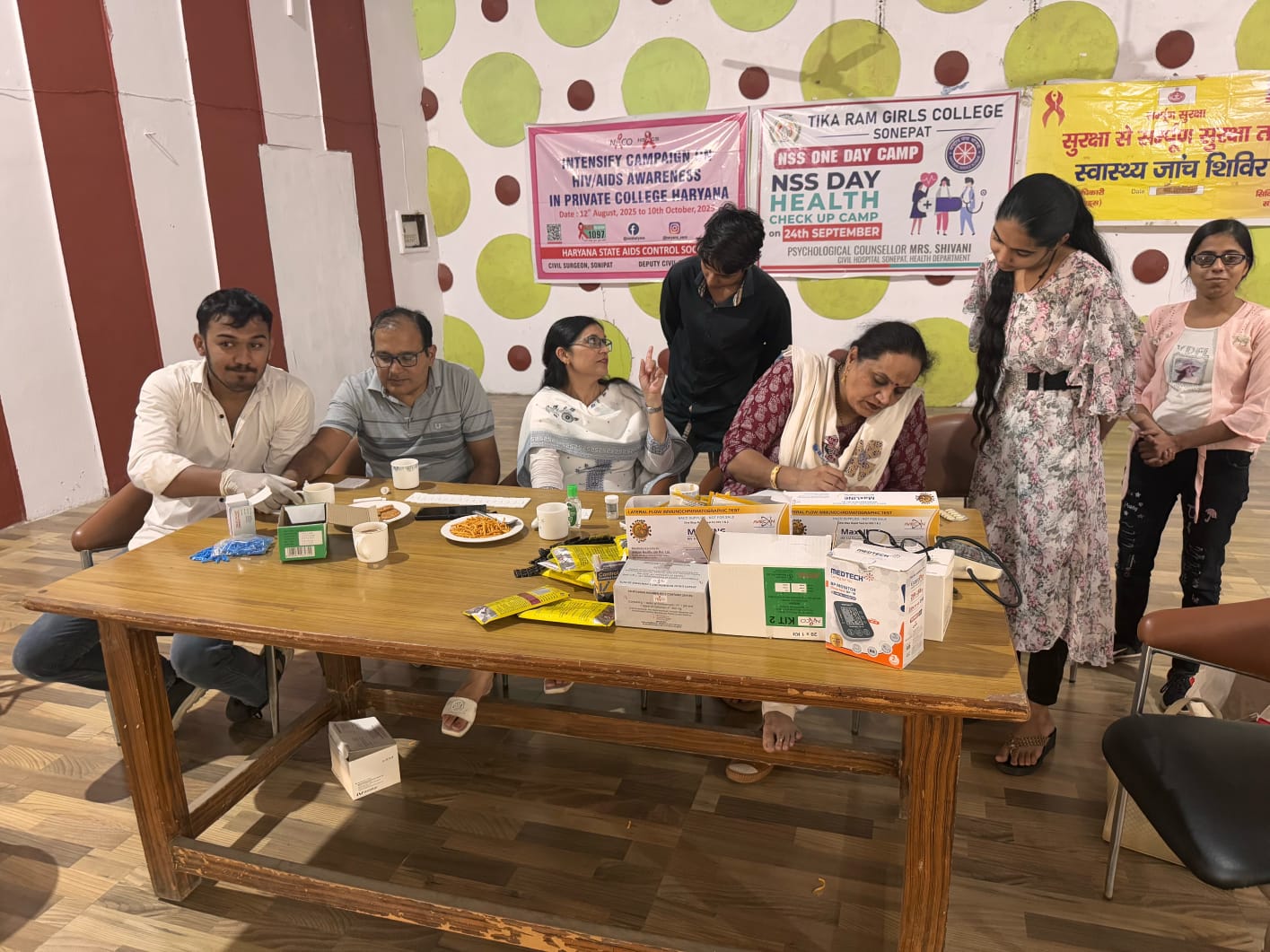 टीकाराम कन्या महाविद्यालय में दिनांक 24 सितम्बर 2025 को NSS Day के उपलक्ष्य में NSS की Unit-1 & II द्वारा एक दिवसीय शिविर के अंतर्गत स्वास्थ्य जाँच शिविर आयोजित किया गया । इस शिविर में psychological counsellor डा. शिवानी, श्रीमती निशा, श्रीमती कुसुम व श्री समुन्दर हुड्डा (LT), शिविल अस्पताल, सोनिपत व उनकी टीम द्वारा द्वारा स्वयंसेविकाओ को एड्स के बारें में जागरूक करते हुए स्वयंसेविकाओ के स्वास्थ्य की जाँच की साथ ही उन्हें iron tablets उपलब्ध करवाई। उन्होनें स्वयंसेविकाओ को अपने आप को सुरक्षित रखने के तरीके बताए । डॉ शिवानी ने स्वयंसेविकाओ का HIV test व उनकी टीम के द्वारा स्वास्थ्य परीक्षण भी किया। साथ ही स्वयंसेविकाओ नें महाविद्यालय प्रांगण की सफाई भी की। कॉलेज प्राचार्या श्रीमती गीता ने डॉ शिवानी व उनकी टीम का स्वागत किया और साथ ही उन्होंने स्वयंसेविकाओ को स्वास्थ्य के प्रति जागरूक किया । इस शिविर की संयोजिका NSS Programme ऑफिसर श्रीमती दीपशिखा व डा. आशा रानी मौजूद रही। इस कैम्प के दौरान 200 स्वयंसेविकाओ की प्रतिभागी रही ।