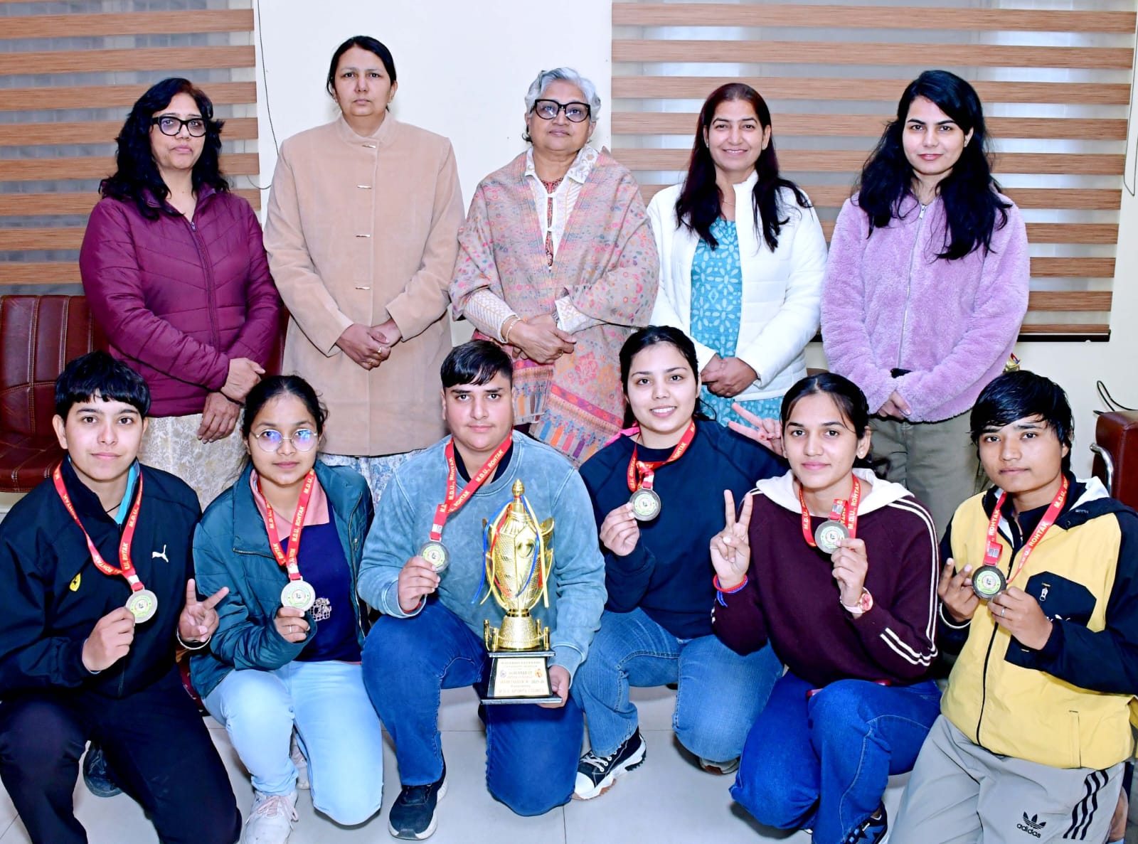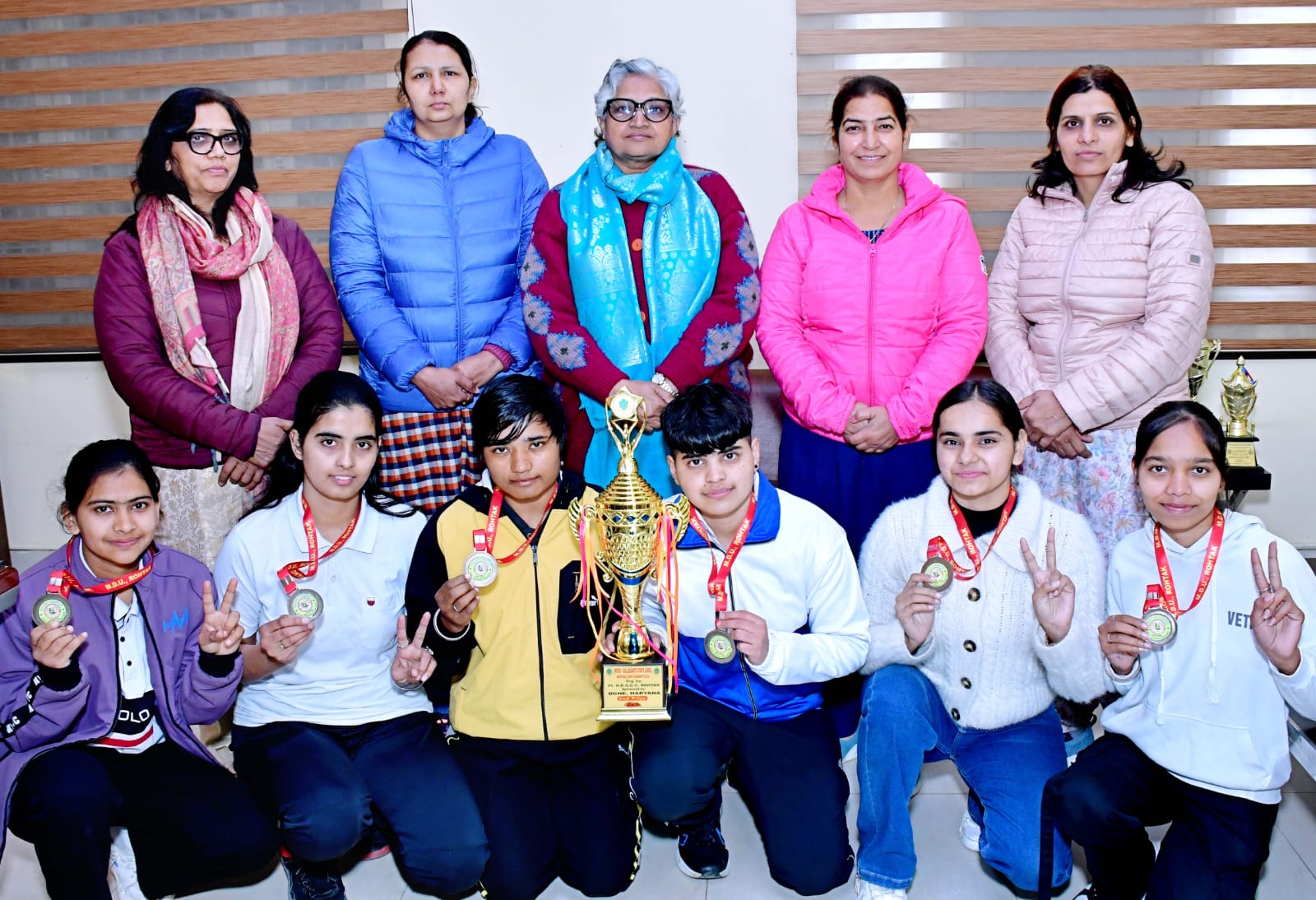 Our Hockey team got gold medal at All India Inter University tournament. Our president sh. Surinder Singh Dahiya congratulated the team for this great achievement. Principal Dr Monika Verma felicitated the girls with sweets for their victory.