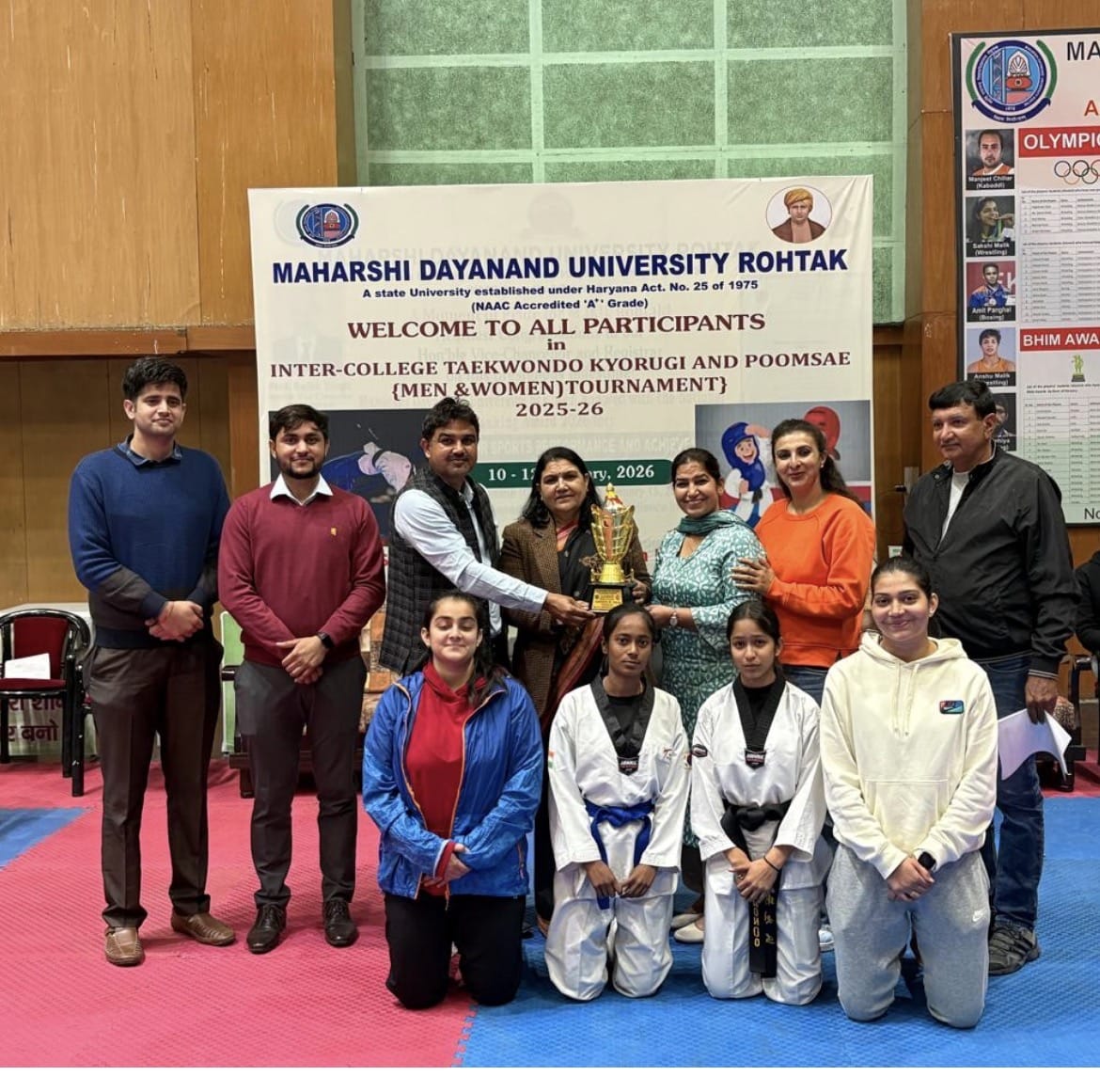 महृषि दयानन्द विश्वविधालय द्वारा आयोजित इंटर कॉलेज ताइक्वांडो प्रतियोगिता में टीकाराम कन्या महाविद्यालय ने प्रथम स्थान प्राप्त किया | प्राचार्या मेडम गीता ने कॉलेज पहुंचने पर छात्राओ का मिठाई खिलाकर स्वागत किया | शारीरिक शिक्षा विभाग की अध्यापिका डॉ सुमन मान ने बताया की यह प्रतियोगिता एम डी यू के स्पोर्ट्स कॉम्प्लेक्स में आयोजित की गयी थी| इस प्रतियोगिता में बी एस सी स्पोर्ट्स और बी पी एड की छात्रा ज्योति ने गोल्ड मेडल, सोनीया ने गोल्ड मेडल, वर्निका ने गोल्ड मेडल, ईशा ने गोल्ड मेडल, सेहनाज़ ने गोल्ड मेडल, सोनाक्षी ने ब्रॉन्ज़ मेडल व नेहा ने सिल्वर मेडल जीतकर कॉलेज का नाम रोशन किया| इसके साथ टीम ने चैंपियन ट्रॉफी हासिल की |स्पोर्ट्स डारेक्टर ने. खिलाड़ियों को ट्रॉफी और मेडल देकर छात्राओं को सम्मानित किया|टीकाराम शिक्षा समिति के प्रधान सुरेंदर सिंह दहिया जी ने भी छात्राओं के उज्ज्वल भविष्य की कामना की| इस अवसर पर शारीरिक शिक्षा विभाग की अध्यापिका डॉ अल्का और ज्योति के साथ साथ गैर शिक्षक कर्मचारियों ने भी छात्राओं की सफलता पर बधाई दि और आगे बढ़ने के लिए प्रेरित किया
