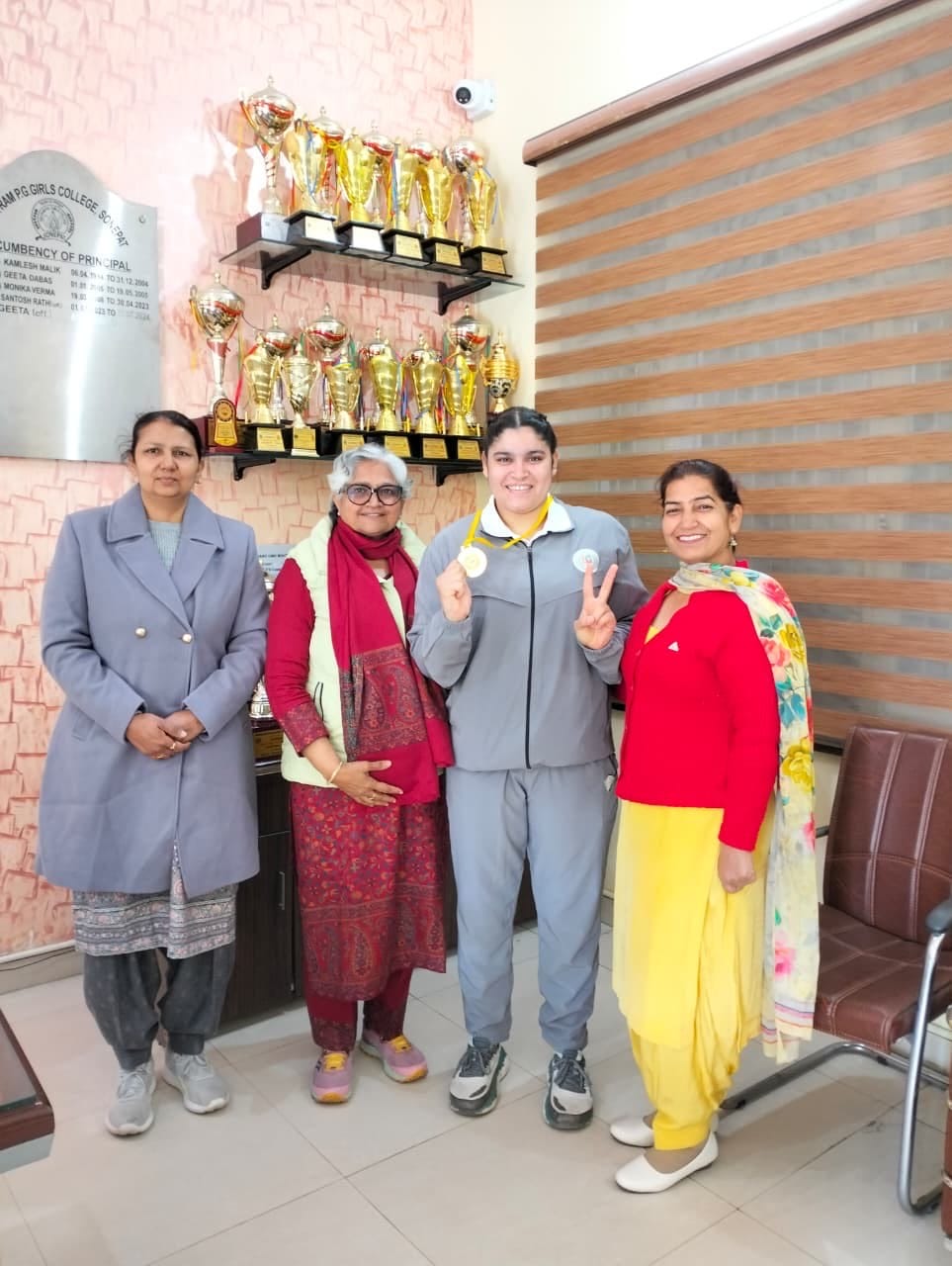 Tamanna, student of B.A Final year of the college, won the silver medal in the recently held Junior National Judo Competition. On the player`s arrival at the college, Tikaram Education Society`s President Sh. Surendra Singh Dahiya, Mr. Bhupendra Dahiya (Secretary), Rajnit Malik (Vice President), Amit (Member) as well as college principal Mrs. Kanchan Sidhar blessed the student and wished her a bright future. The faculty of Physical Education Department Dr. Suman Maan told that this competition was held in Dehradun from 28 March to 31 March, in which Tamanna won the silver medal in the 78 kg weight category and brought laurels to the college and the state. Physical Education Department teacher Dr. Alka also congratulated the student and wished her a bright future.