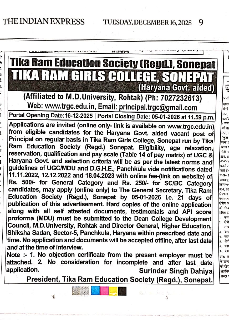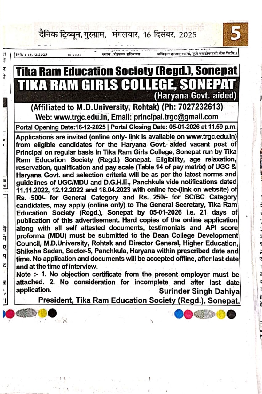 Advertisement for the post of Principal (Female) for Tikaram Girls College, Sonepat